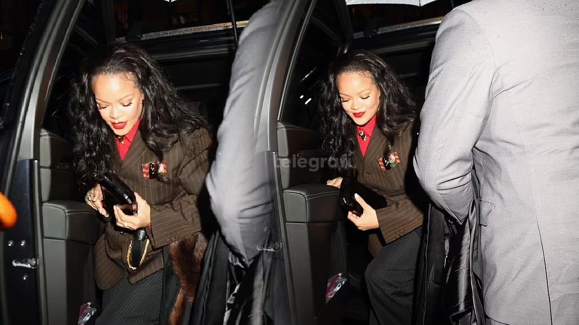 Rihanna u shfaq në stil në darkën e përvitshme para Met Gala-së në shtëpinë e Anna Wintour në New York, e veshur me një pallto elegante me vija.