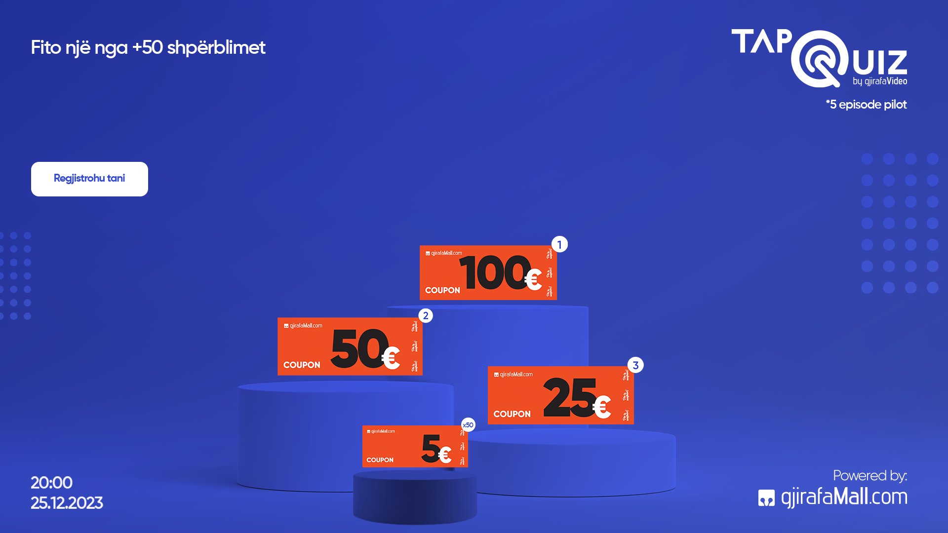 Vend i parë: Kupon vlerë 100€ në GjirafaMall https://gjirafamall.com Vend i dytë: Kupon vlerë 50€ në GjirafaMall https://gjirafamall.com Vend i tretë: Kupon vlerë 25€ në GjirafaMall https://gjirafamall.com Vendet 4-54: Kupona nga 5€ në GjirafaMall https://gjirafamall.com