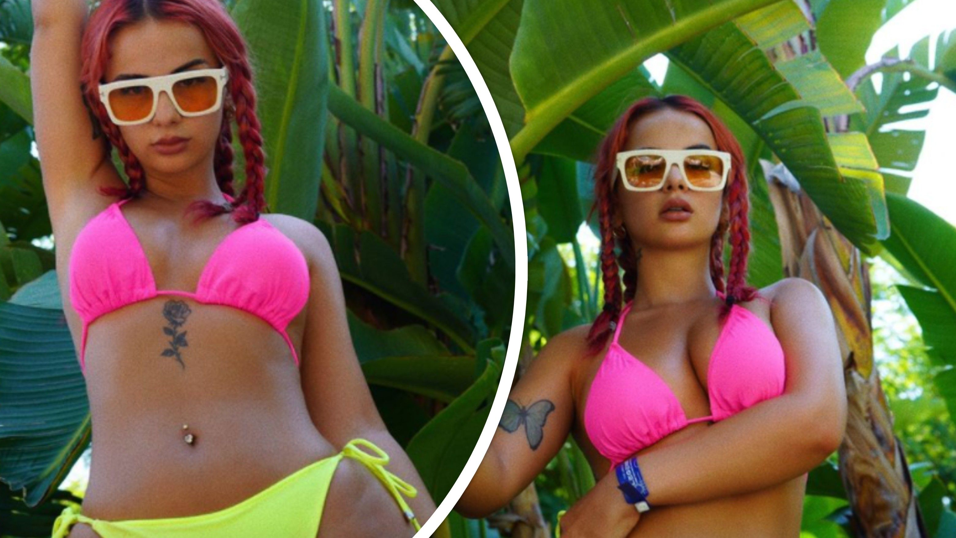 Në një palë bikini neon, ngjyrë rozë e të gjelbër, 21-vjeçarja duket në top formë.