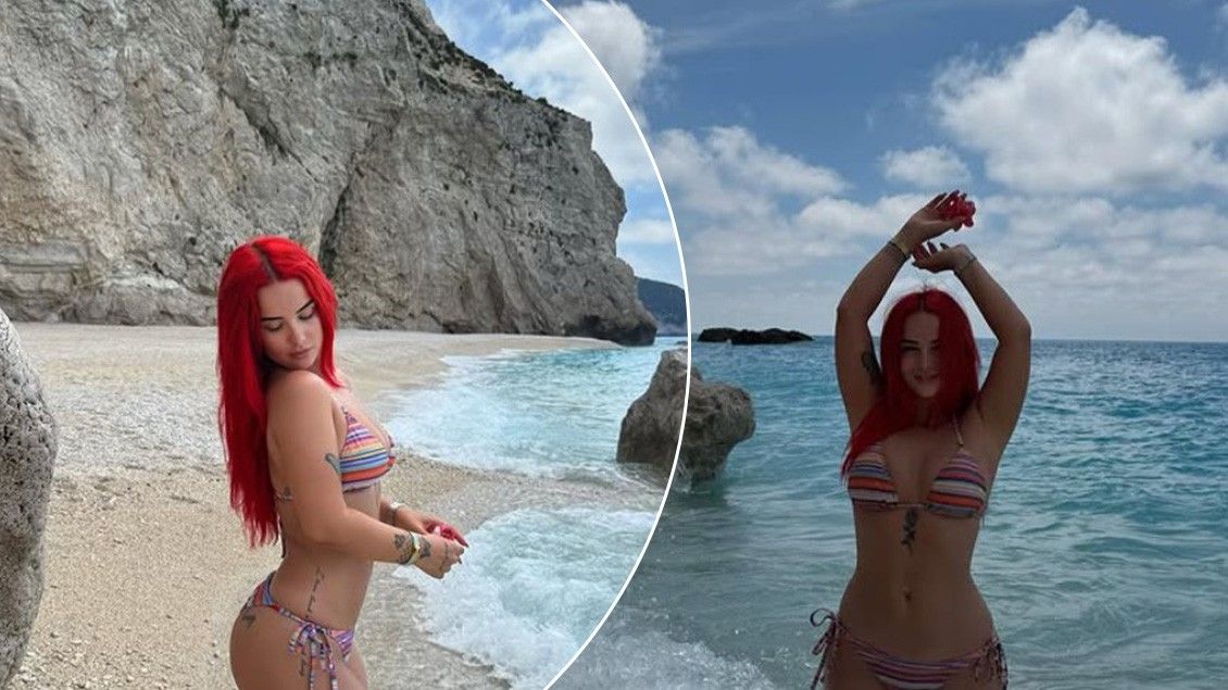 Artistja shfaqet me bikini shumëngjyrëshe dhe flokë të kuqe të ndezur, duke sjellë një kombinim të fortë vizual që bie menjëherë në sy.