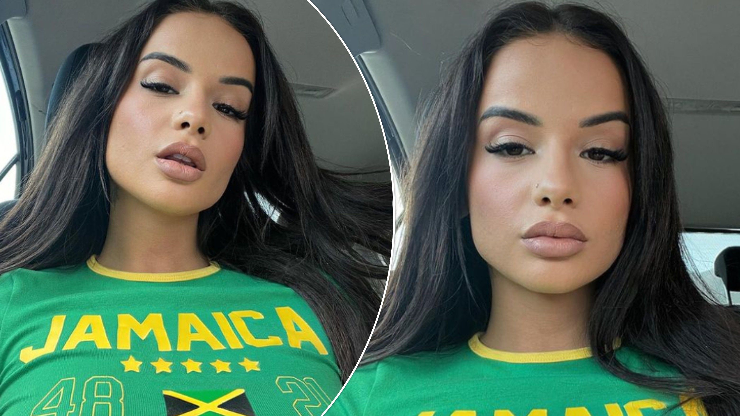 Në imazhe, Rina shihet e veshur me një bluzë të gjelbër me të verdhë me mbishkrimin "Jamaica".