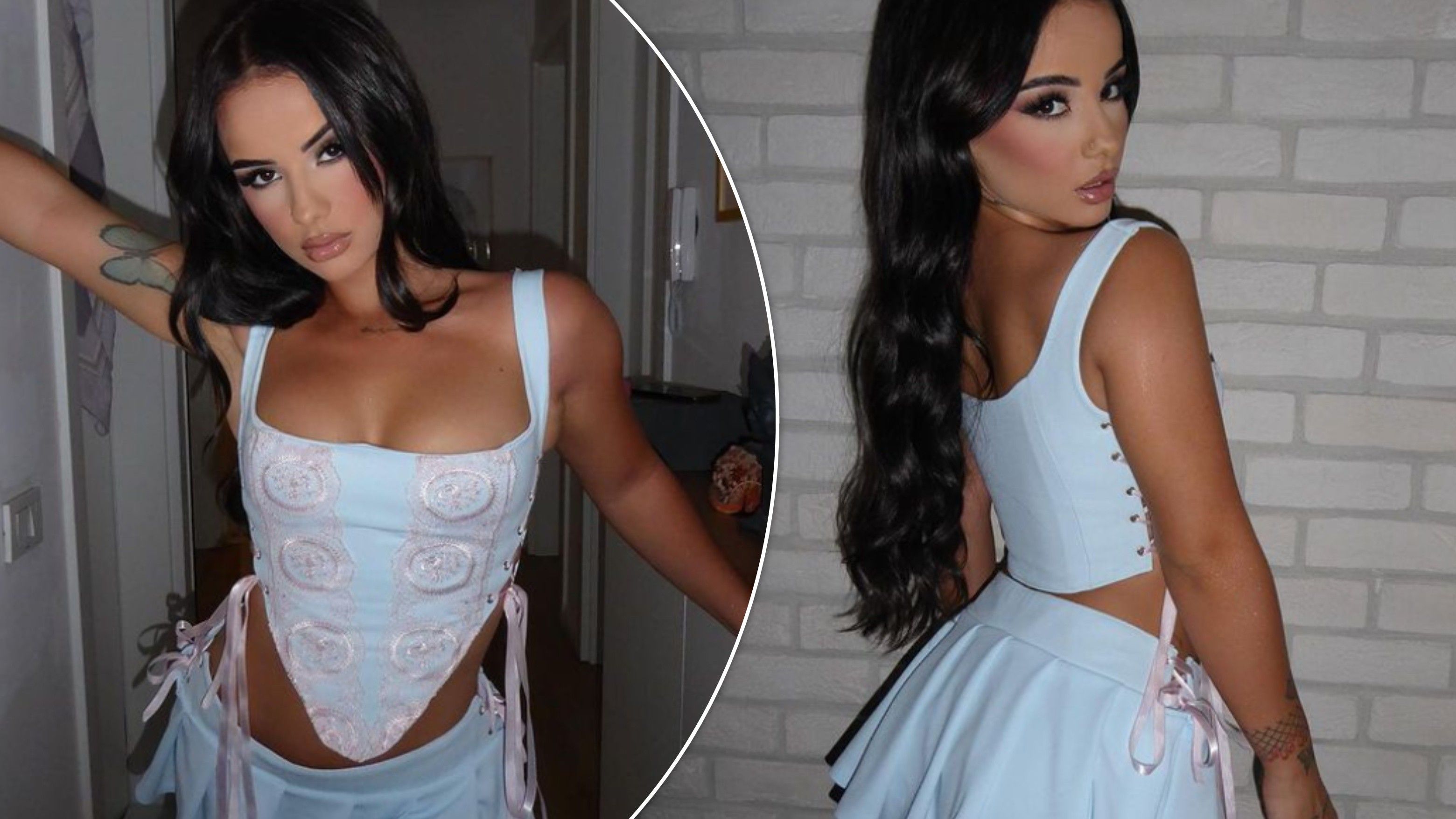 Artistja shihet e veshur me një kostum të shkurtër që përbëhej nga një bluzë dhe dekolte te hapur dhe mini-fund ngjyrë të kaltër me detaje rozë dhe një palë atlete.