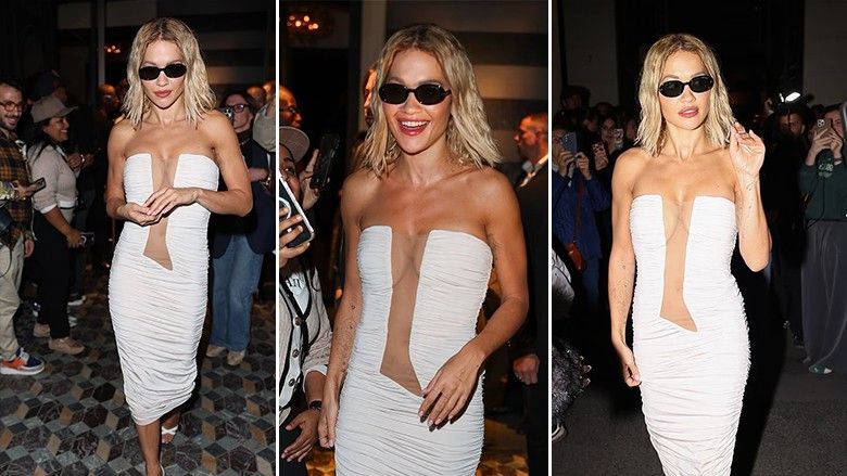 Rita Ora guxon me dekoltenë e hapur në fustanin e bardhë, ndërsa shfaqet në restorantin e "Le Costes" gjatë Javës së Modës në Paris