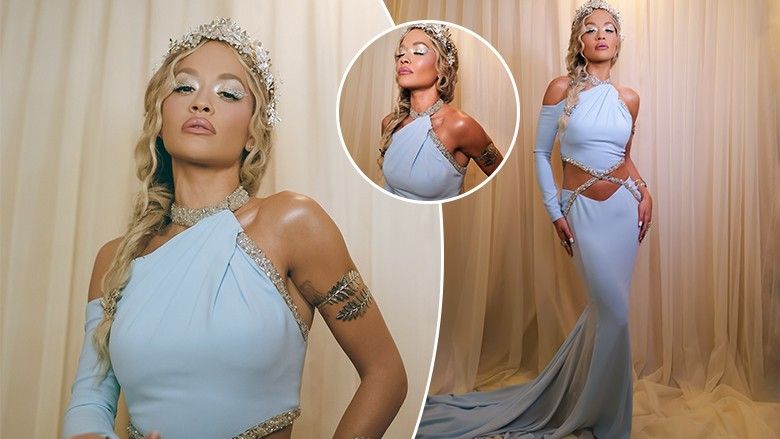 Në disa fotografi të publikuara në rrjetet sociale, Rita ka zgjedhur një fustan të kaltër të mrekullueshëm dhe ka kompletuar pamjen me aksesore në kokë, të cilat e bënë të shkëlqente si një figurë mitologjike.