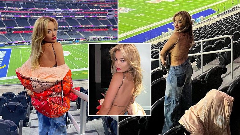 Rita Ora, një tifoze atraktive e futbollit amerikan në tribunat e stadiumit "SoFi" në Kaliforni