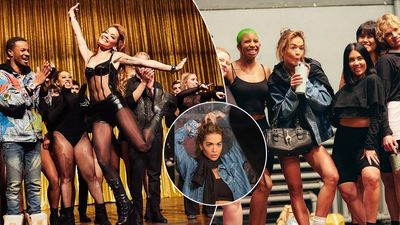 Në disa prej fotove ajo pozon me veshje sportive dhe pamje natyrale, duke dhënë përshtypjen e një dite intensive pune, ndërsa në të tjera shihet mes ekipit të kërcimtarëve dhe stafit, me buzëqeshje e gjendje të mirë – detaje që e bëjnë postimin të duket më shumë si një kujtim personal sesa thjesht promovim.