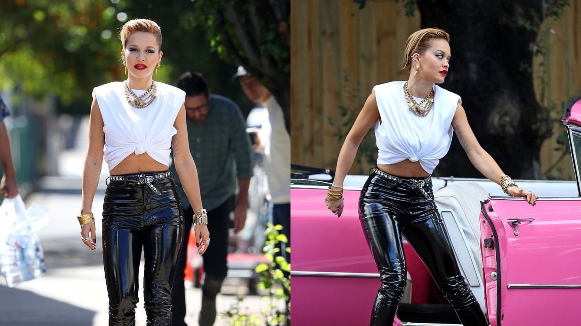Këngëtarja ndër të tjera arriti në vendin e destinuar me nja makinë luksoze, që ishte me ngjyrë rozë.