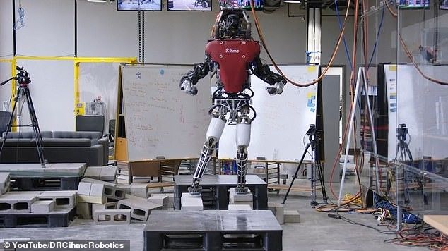 Në pamjet e shpërndara, shihet roboti teksa hedhë hapat me precizitet nëpër blloqe dhe në një shirit, i ndihmuar nga LIDAR që I ka në trup.