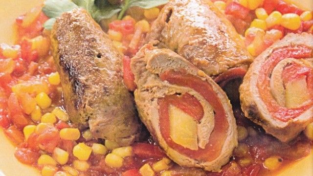 4. Medaljonet e rrahur me çekan druri Iyhen me mustardë, në secilin prej tyre vendoset nga një thelë speci të pjekur, nga një rriskë patate dhe medaljonet mbështillen si roladë dhe përforcohen me rrëmojëse.