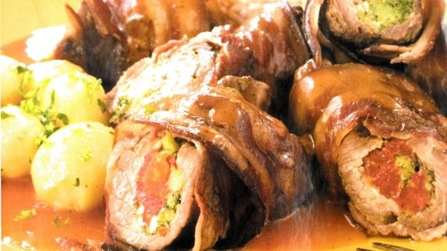 7. Filetat e bëra role mbështillen me feta proshute dhe përforcohen me rrëmojëse.
