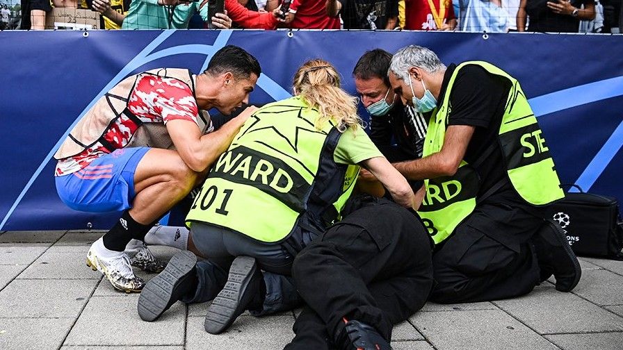Ndërkohë, edhe vet Ronaldo e kaloi barrierën për ta ndihmuar dhe për ta shikuar se si ishte roja femër, e cila po qëndronte e shtrirë dhe ishte në dhimbje.