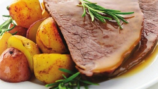 Shërbejeni mishin të prerë në feta e të lagur paksa me lëngun e pjekjes të shoqëruara me patatet dhe qepët. /Telegrafi/