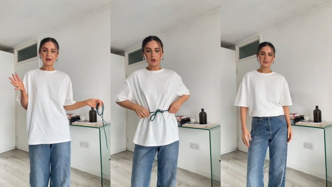Për ta ndryshuar madhësinë e bluzës, pa e shkurtuar, influencerja Sherrie Webster përdori një lidhëse të këpucëve.