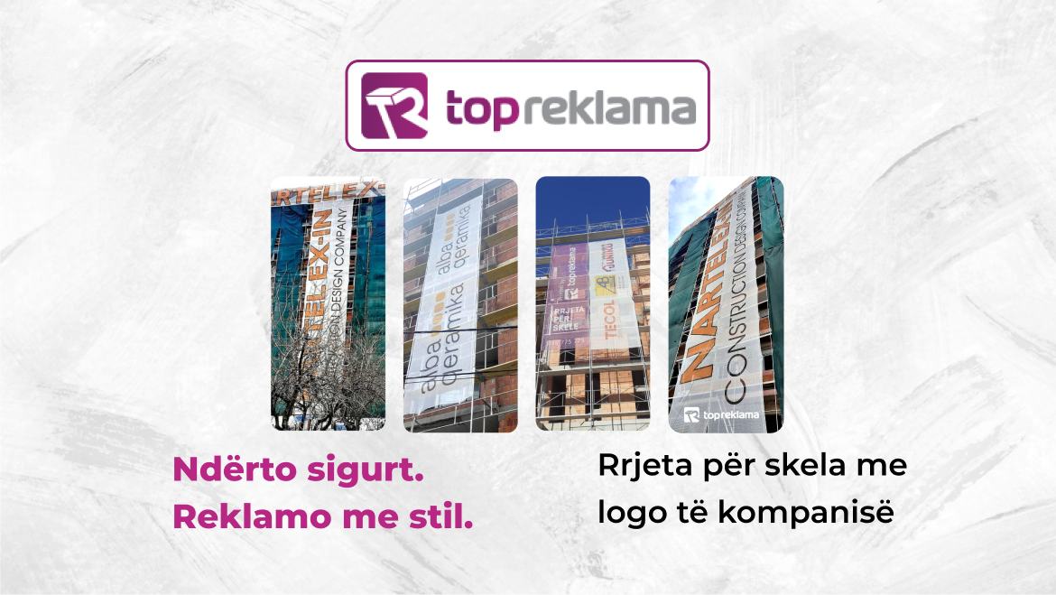Reklamë dhe siguri – të dyja në një zgjidhje Kompania Top Reklama ofron rrjeta për skela me logo të personalizuar për vetëm 1.90€ për metër katror, me përmasa standarde 2.5 x 100m ose 2 x 100m. Këto rrjeta ofrojnë jo vetëm mbrojtje fizike, por edhe dukshmëri të madhe për markën, duke e bërë çdo ndërtesë në ndërtim një billboard gjigand.