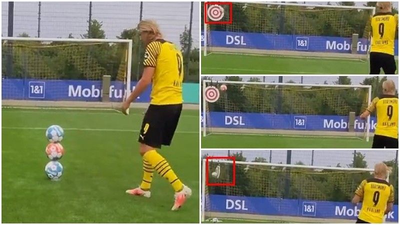 Haaland vendosi tre topa njëra mbi tjetrën dhe më pas arriti në mënyrë të jashtëzakonshme të godiste një objektiv që ishte vendosur në cepin e sipërm të portës, me secilën prej tyre që qëlloi cakun, ndërsa asnjëri top nuk u rrëzua.