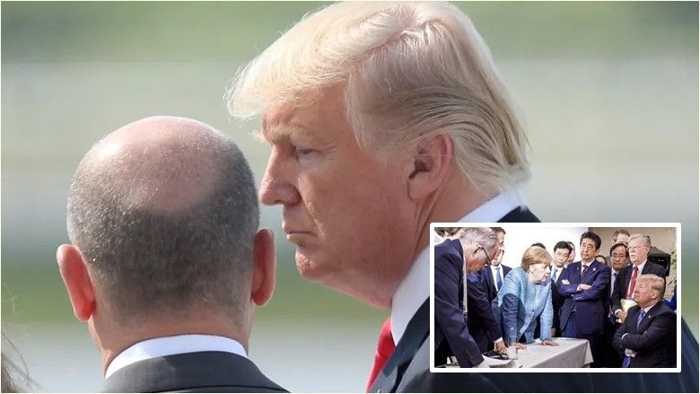 Një fotografi ikonë, e marrë në samitin e G7 në 2017, tregon Trump të ulur, duke buzëqeshur ndërsa Merkel e shikon atë.