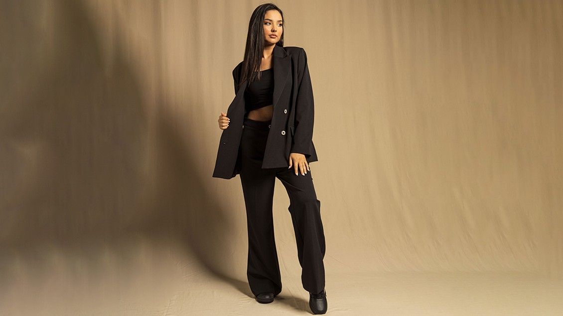 Ky kostum vjen në model ‘oversized’, ka ngjyrë të zezë dhe ju mund ta kombinoni me taka, atlete e gjithashtu këpucë të rrafshta.