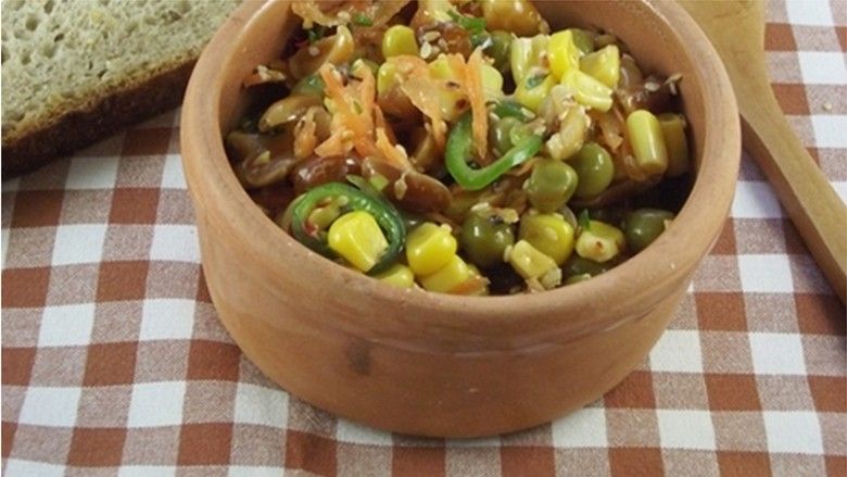Sallatë me misër, bizele, kikirikë dhe susam