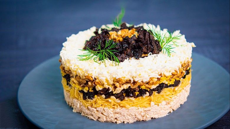 Sallatë me mish pule, me arra dhe me kumbulla të thata