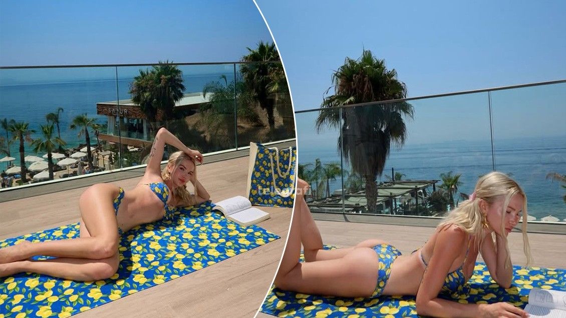 E veshur me bikini ngjyrë blu me motive limonësh, ajo pozoi mbi një ballkon me pamje mahnitëse nga deti, duke treguar stilin e saj të freskët dhe elegant për këtë sezon.