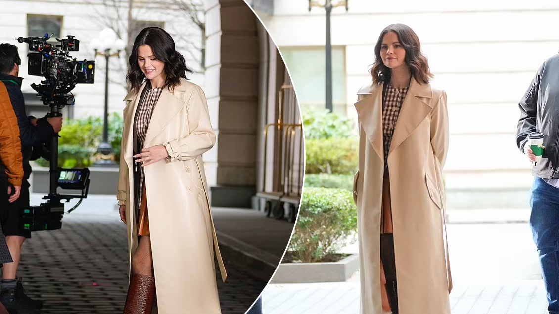 E veshur me një pallto bezhë elegante, një fund lëkure dhe çizme bordo me stil, Selena dukej në formë të shkëlqyer teksa xhironte një skenë bashkë me bashkë-yjet e saj, Steve Martin dhe Martin Short.