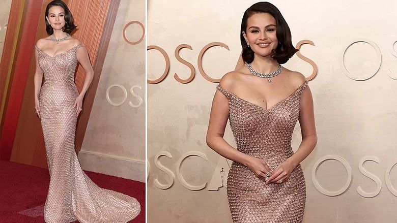 Selena Gomez shkëlqeu në tapetin e kuq të Academy Awards 2025 në Los Angeles, duke veshur një fustan mahnitës nga Ralph Lauren në një nuancë rozë të butë, të zbukuruar me rruaza.