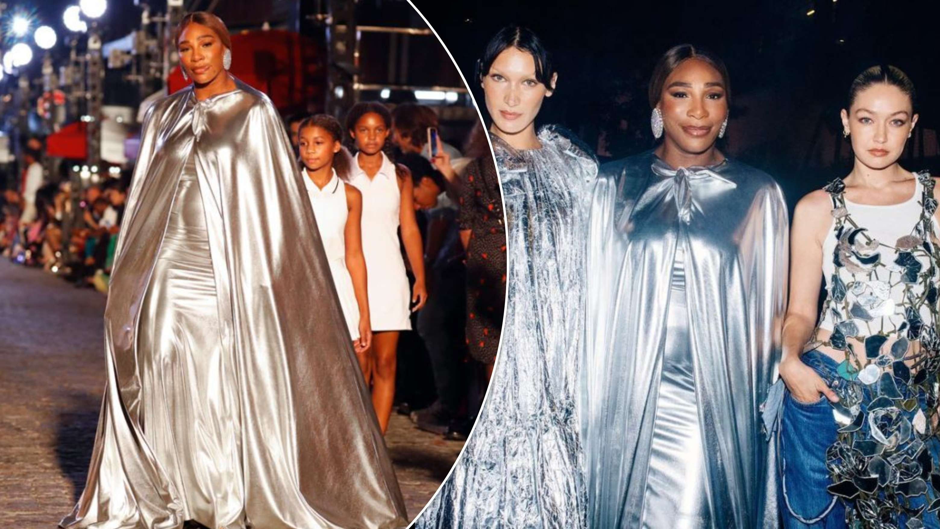 Serena Williams hapi sfilatën e pistës së Vogue World gjatë javës së modës në New York të hënën, e veshur me një fustan Balenciaga në ngjyrë argjendi metalike dhe pelerinë të përshtatshme deri në dysheme.