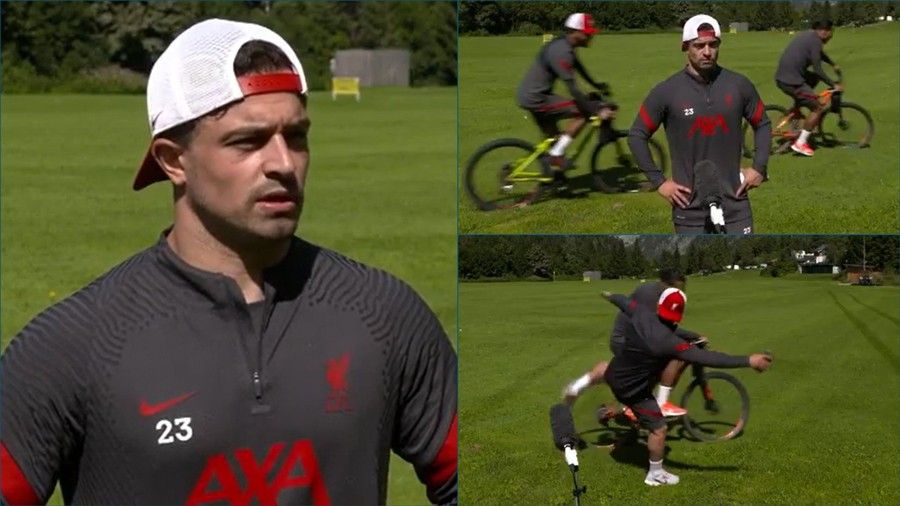 Mesfushori i Liverpoolit, Xherdan Shaqiri, është përpjekur ta shkelmojë me shaka Virgil van Dijkun, pasi qendërmbrojtësi kishte ndërhyrë në intervistën e tij duke u sjellë me biçikletë.