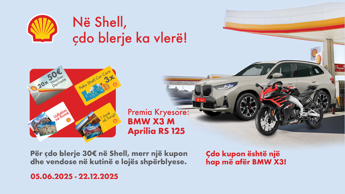 Shell Kosova fton qytetaret t’i bashkohen fushatës më të madhe shpërblyese në vend, “Në Shell, çdo blerje ka vlerë!”, duke i dhënë mundësi të artë të gjithë konsumatorëve të hyjnë në garë për të fituar BMW X3, Motoçikleta Aprilia RS125 deri te udhëtime, pako dhuratash dhe voucher për karburant.