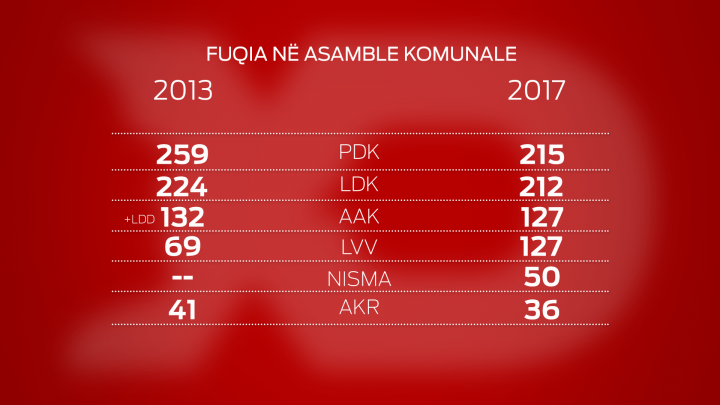 Ngjashëm PDK-së i zvogëluan ulëset në 6 nga 7 sa i kishte më 2013 sikurse AKR që ra në 3 ulëse nga 4 sa i ka pasur.