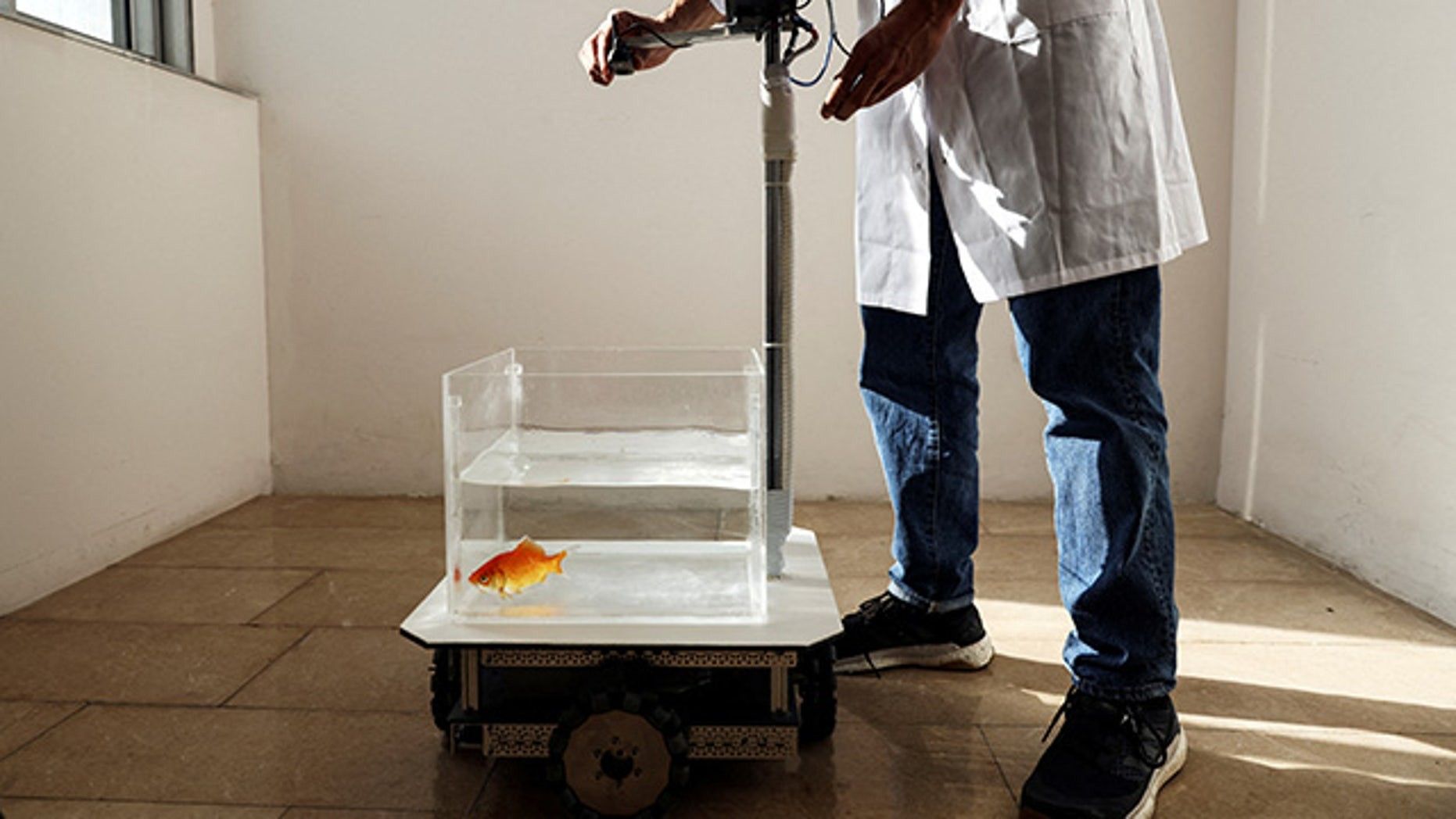 Studiuesit në Universitetin Ben-Gurion të Izraelit kanë ndërtuar një rezervuar peshku vetëlëvizës mbi rrota që peshqit e kuq brenda rezervuarit mund ta lëvizin atë në tokë.