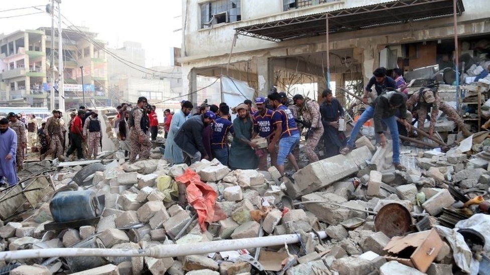 Pamjet nga vendi i ngjarjes treguan dritaret dhe dyert e shpërthyera në ndërtesën e Habib Bank; automjetet e dëmtuara dhe dokumentet e shpërndara nëpër rrugë.