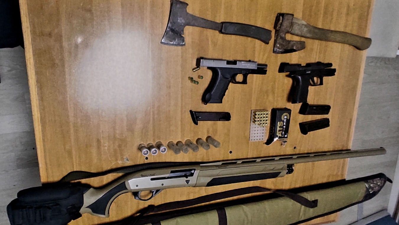 Tek të dyshuarit janë gjetur dhe konfiskuar: Një pushkë gjahu me 3 fishekë dhe 5 gëzhoja, një revole me 2 karikatorë dhe 23 fishekë, një revole tjetër me 1 karikator dhe 5 fishekë, dy sopata.
