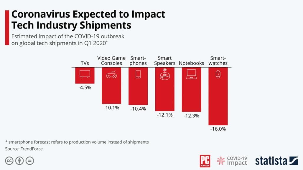 Sipas TrendForce, një kompani kineze për kërkime të tregut, numrat e prodhimit për tremujorin e parë të vitit 2020 pritet të goditen fort në televizion (-4.5 për qind), tastierë për video lojëra (-10.1 për qind), smartphone (-10.4 për qind), sektorët e altoparlantëve (-12.1 për qind), Notebook (-12.3 për qind), dhe smartwatch (-16 për qind). Sa më shumë objektet e prodhimit të mbeten të mbyllura ose të funksionojnë me një kapacitet të zvogëluar, aq më shumë kompani të teknologjisë do të vazhdojnë të humbasin.