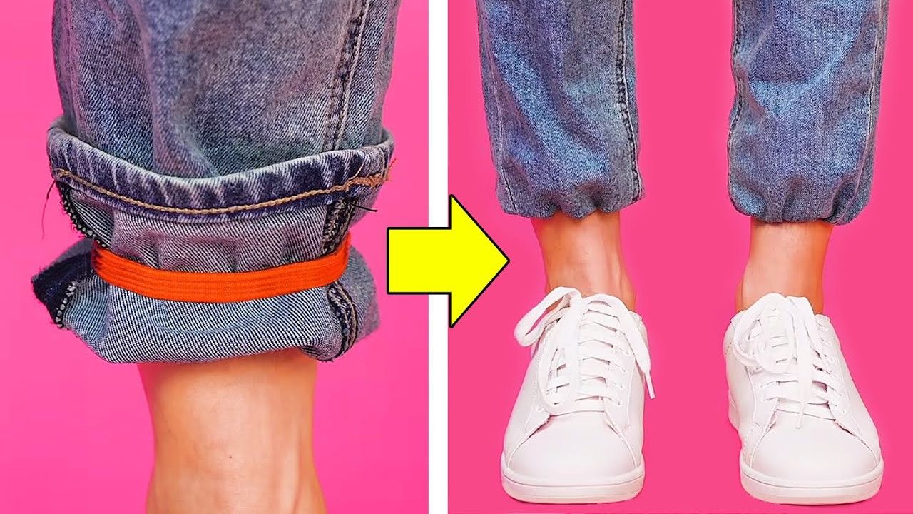 Për fat të mirë, problemin e xhinseve shumë të gjata mund ta zgjidhim me një llastik në një këmbë pak të palosur. Mbuloni pjesën e palosur, por sigurohuni që llastiku të qëndrojë në të njëjtin vend dhe më pas palosni xhinset nga brenda.