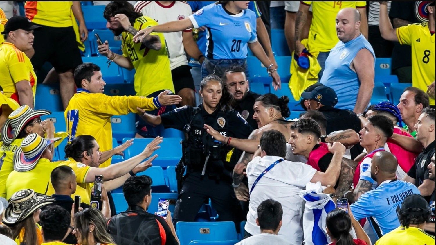 Megjithatë, dueli do të mbahet mend për skenat e tmerrshme pas ndeshjes. Tifozët uruguaianë dhe kolumbianë patën një përplasje në tribuna dhe futbollisti i Liverpool, Darwin Nunez u bashkua me ta.