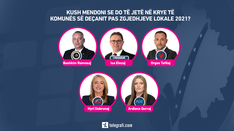 Në garë për kryetar të Deçanit janë pesë kandidatë: Bashkim Ramosaj (AAK), Isa Elezaj (kandidat i pavarur), Orges Tafilaj (LVV), Hyri Dobrunaj (LDK) dhe Ardiana Qorraj (PDK).
