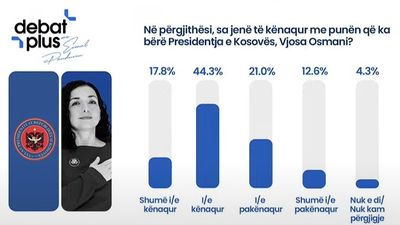 Konkretisht, 17.8% e të anketuarve janë “shumë të kënaqur” dhe 44.3% janë “të kënaqur” me punën e Presidentes, duke përbërë gjithsej 62.1% mbështetje pozitive.