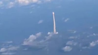 I kapur nga një vend pranë dritares gjatë fluturimit, pamjet tregojnë raketën teksa ngjitet lart dhe lë një gjurmë të ndritshme pas, duke kaluar nëpër re.