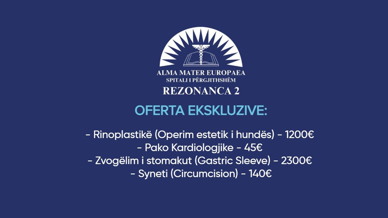 Në botën e sotme me ritme të shpejta, kujdesi për shëndetin dhe pamjen tuaj është më i rëndësishëm se kurrë.Në Spitalin e Përgjithshëm "Rezonanca 2", ne e kuptojmë këtë nevojë dhe jemi krenarë të paraqesim katër oferta fantastike të dizajnuara për të përmirësuar mirëqenien tuaj dhe për të rritur besimin tuaj. - Rinoplastikë (Operim estetik i hundës) - 1200€- Pako Kardiologjike - 45€- Zvogëlim i stomakut (Gastric Sleeve) - 2300€- Syneti (Circumcision) - 140€Po kërkoni të përmirësoni harmoninë e fytyrës tuaj dhe të përsosni estetikën e hundës që keni dëshiruar gjithmonë? Mos kërkoni më tej! Procedura jonë e rinoplastikës, me një çmim prej vetëm 1200€, ju ofron mundësinë për të përmirësuar profilin tuaj me ekspertizën e kirurgëve tanë të aftë. Rinoplastika, e njohur zakonisht si operacioni i hundës, mund të adresojë një sërë shqetësimesh, nga riformimi i majës së hundës deri tek korrigjimi i problemeve të frymëmarrjes. Në "Rezonanca 2", ne kombinojmë saktësinë, mjeshtërinë dhe kujdesin e personalizuar për t'ju siguruar që të arrini rezultate me pamje natyrale që plotësojnë tiparet tuaja unike të fytyrës.Ky operacion do të kryhet nga Dr. Arsim Elezaj, një mjek i kualifikuar dhe me shumë përvojë. Me pajisje dhe ambiente moderne, ne garantojmë kujdes të dedikuar dhe të besueshëm.Përparoni shëndetin e zemrës suaj me pakon tonë të kardiologjisë për vetëm 45€!Zemra juaj meriton kujdesin maksimal. Me pakon tonë gjithëpërfshirëse të kardiologjisë me një çmim të përballueshëm 45€, ju siguroni mirëqenien e zemrës suaj përmes një sërë testesh diagnostikuese dhe konsultimesh me kardiologët tanë me përvojë. Kjo pako përfshin:- Vizitë kardiologjike- EKG- Ultrazë i zemrës (Ekokardiografi)- Ergometri- AnalizaJepni prioritet shëndetit tuaj të zemrës sot në Spitalin e Përgjithshëm "Rezonanca 2"!Po luftoni me humbjen e peshës dhe kërkoni një zgjidhje afatgjatë? Me vetëm 2300€, ju hidhni hapin e parë drejt një të ardhmeje më të shëndetshme dhe më të lumtur me kujdesin dhe mbështetjen e ekspertëve të Spitalit të Përgjithshëm "Rezonanca 2",. Ky operacion i ngushtimit të lukthit mund t'ju ndihmojë të arrini qëllimet tuaja për humbje peshe dhe të përmirësoni shëndetin tuaj të përgjithshëm. Kjo ndërhyrje kryhet nga Prof. Dr. Ferat Sallahu, pionieri i kësaj metode në vendin tonë, me mbi 300 operacione të suksesshme. Procedura realizohet me vetëm 4 vrima dhe është tani e disponueshme në Spitalin e Përgjithshëm Rezonanca 2, në rrugën Prishtinë – Ferizaj, afër Prishtina Mall.Kirurgët tanë me përvojë ofrojnë kujdes gjithëpërfshirës para dhe pas operacionit, duke siguruar që udhëtimi juaj të jetë sa më i qetë dhe i suksesshëm. Syneti e sigurt dhe profesionale për fëmijën tuajSigurimi i mirëqenies së fëmijës suaj është parësor. Qoftë për arsye mjekësore, kulturore apo personale, ekipi ynë i profesionistëve me përvojë siguron që procedura të kryhet në mënyrë të sigurt dhe efikase, pa asnjë shqetësim. Besojini ekipit tonë të aftë mjekësor për të ofruar shërbimin e synetisë me një çmim të arritshëm prej 140€. Përjetoni kujdesin e duhur dhe ekspertizën profesionale në Spitalin e Përgjithshëm "Rezonanca 2", ku shëndeti i familjes suaj është prioriteti ynë.Nga përmirësimet estetike deri te procedurat shëndetësore që ndryshojnë jetën, ekipi ynë i profesionistëve me përvojë është i përkushtuar për të ofruar kujdes të nivelit të lartë me çmime të pakrahasueshme.Mos i humbisni këto oferta fantastike në Spitalin e Përgjithshëm "Rezonanca 2", ku ekselenca në kujdesin shëndetësor takohet me përballueshmërinë. Udhëtimi juaj drejt shëndetit dhe mirëqenies optimale fillon këtu!Na kontaktoni në numrin e telefonit049 603 330 ose në rrjetin social Facebook “Spitali i Përgjithshëm Rezonanca 2” për të mësuar më shumë dhe për të caktuar takimin tuaj.Shëndeti dhe lumturia juaj janë prioritetet tona kryesore. Le t'ju ndihmojmë të transformoni jetën tuaj me shërbimet tona të jashtëzakonshme mjekësore dhe ofertat e pakrahasueshme!