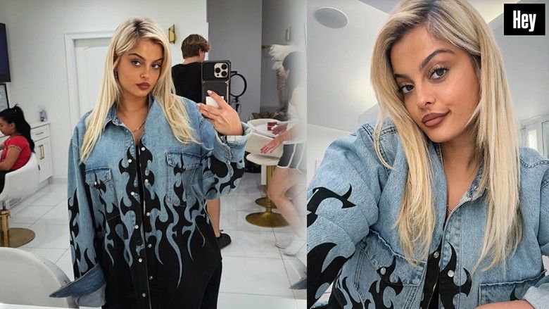 Në imazhin e publikuar në InstaStory, ajo shfaqet në një sallon bukurie, me flokët bionde të lëshuara dhe grim të lehtë, ndërsa gjithë vëmendja bie mbi këmishën xhins me dizajn “flakësh” që kalojnë nga bluja e qetë në të zezë dramatike.