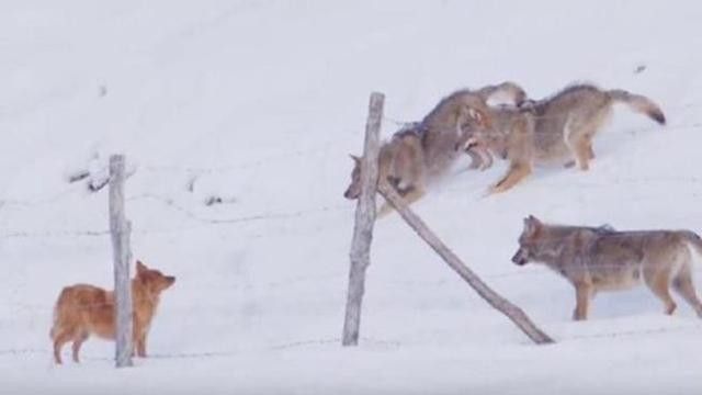 Në video, ujqërit mund të shihen duke rrethuar një qen të zbutur, i cili duket se gjendet në një qoshe në anën e gabuar të një gardhi me tela me gjemba.