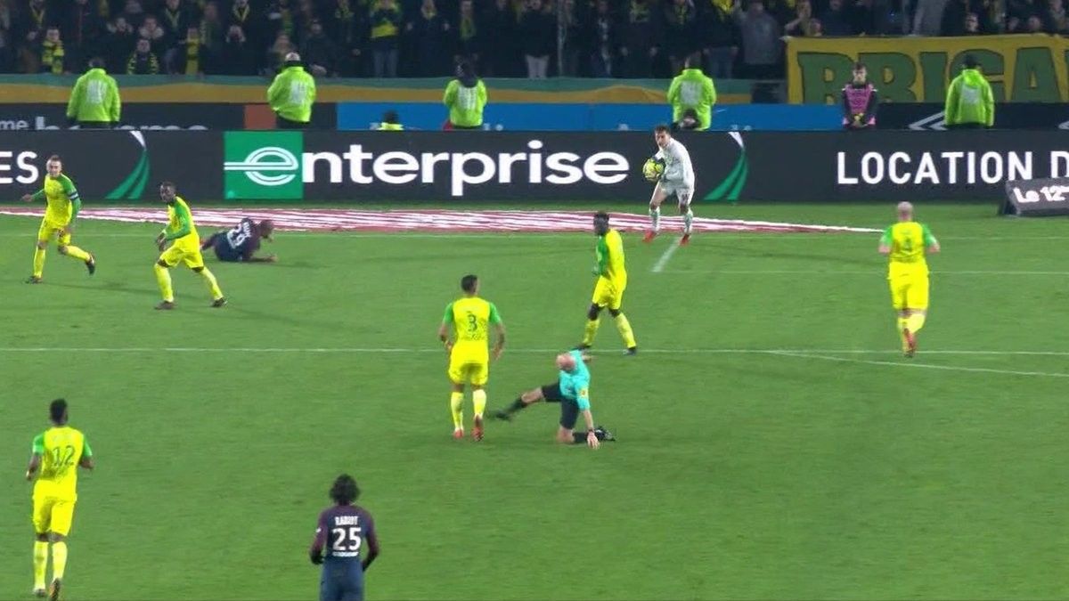 Kjo pasi, lojtari i Nantes, Diego Carlos e rrëzoi gjyqtarin Chapron, i cili reagoi keq duke e goditur atë me këmbë dhe pastaj duke e ndëshkuar me të kuq.