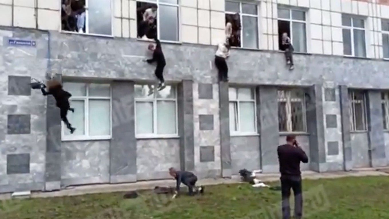 Pamje të publikuara në mediat sociale tregojnë studentët që evakuohen duke kërcyer nga dritaret e katit të dytë në Universitetin Shtetëror të Perm në qytetin e Perm rreth 1,300 kilometra në lindje të Moskës.
