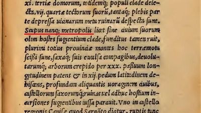 Në Provincën e Dardanisë, njëzet e katër kështjella u shembën në të njëjtën kohë nga një tërmet i fortë. Prej tyre, dy u varrosën plotësisht së bashku me banorët e tyre, katër humbën gjysmën e ndërtesave të tyre së bashku me banorët, njëmbëdhjetë kishin një të tretën e shtëpive të tyre dhe po aq njerëz humbën, shtatë kishin një të katërtën e shtëpive së bashku me të gjithë banorët. Në fund, vendet fqinje u braktisën nga frika e shkatërrimit. Sepse, metropoli i Scupit [pra, Shkupi si qendër e Dardanisë, J. D.] u shkatërrua plotësisht, megjithëse nuk humbi asnjë nga qytetarët e tij që ikën para armikut të tyre [qytetarët e Shkupit në ndërkohë, para tërmetit kishin braktisur qytetin duke ikur nga armiku, J. D.]. Pjesa më e madhe e maleve të provincës u nda nga ky tërmet, gurët u shqyen nga masivet e tyre dhe pemët u shkulën. Nëpër një gjatësi prej tridhjetë milje toka u ça me një gjerësi prej dymbëdhjetë hapash dhe përgatiti një humnerë të thellë ku ranë shumë nga qytetarët që iknin nga rrënojat e kështjellave dhe shkëmbinjve, ose nga inkursionet e mëtejshme të armikut [...]!