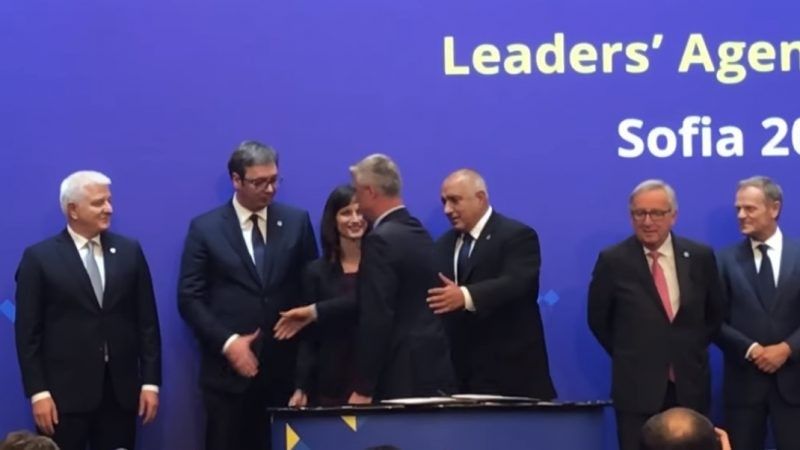 Borissov siç shihet në një video ka “tërhequr” Thaçin që të shtrëngojë duart edhe me krerët shtetërorë të vendeve të Ballkanit Perëndimor që ndodheshin në të djathtën e tij.