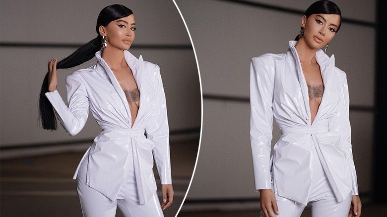 Ajo duket mjaft tërheqëse e veshur me një kostum të bardhë, ndërsa merr vëmendjen me dekoltenë e hapur.