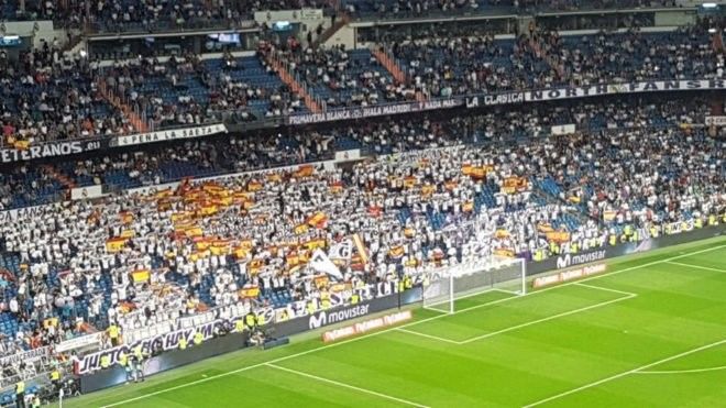 Po ashtu në minutën e 12-të të gjithë një zëri kënduan ‘Rroftë Spanja”, kjo ishte një tjetër mbështetje që tifozët e klubit madrilen bën për shtetin spanjoll në këtë situatë të rëndë.