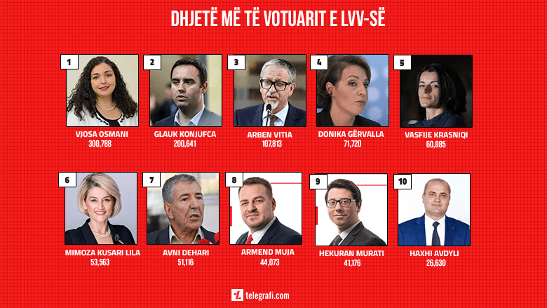 Në vendin e katërt është Donika Gërvalla me 71 mijë e 720, ndërkaq në vendin e pestë është Vasfije Blair me 60 mijë e 887 vota. /Telegrafi/