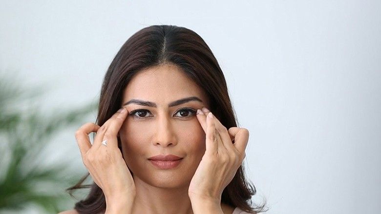 Vendosni majat e gishtave përgjatë vijës së flokëve dhe rrëshqitini butësisht poshtë drejt vetullave. Kjo ndihmon të zbuten rrudhat horizontale dhe të lehtësohet tensioni pas një dite të gjatë.